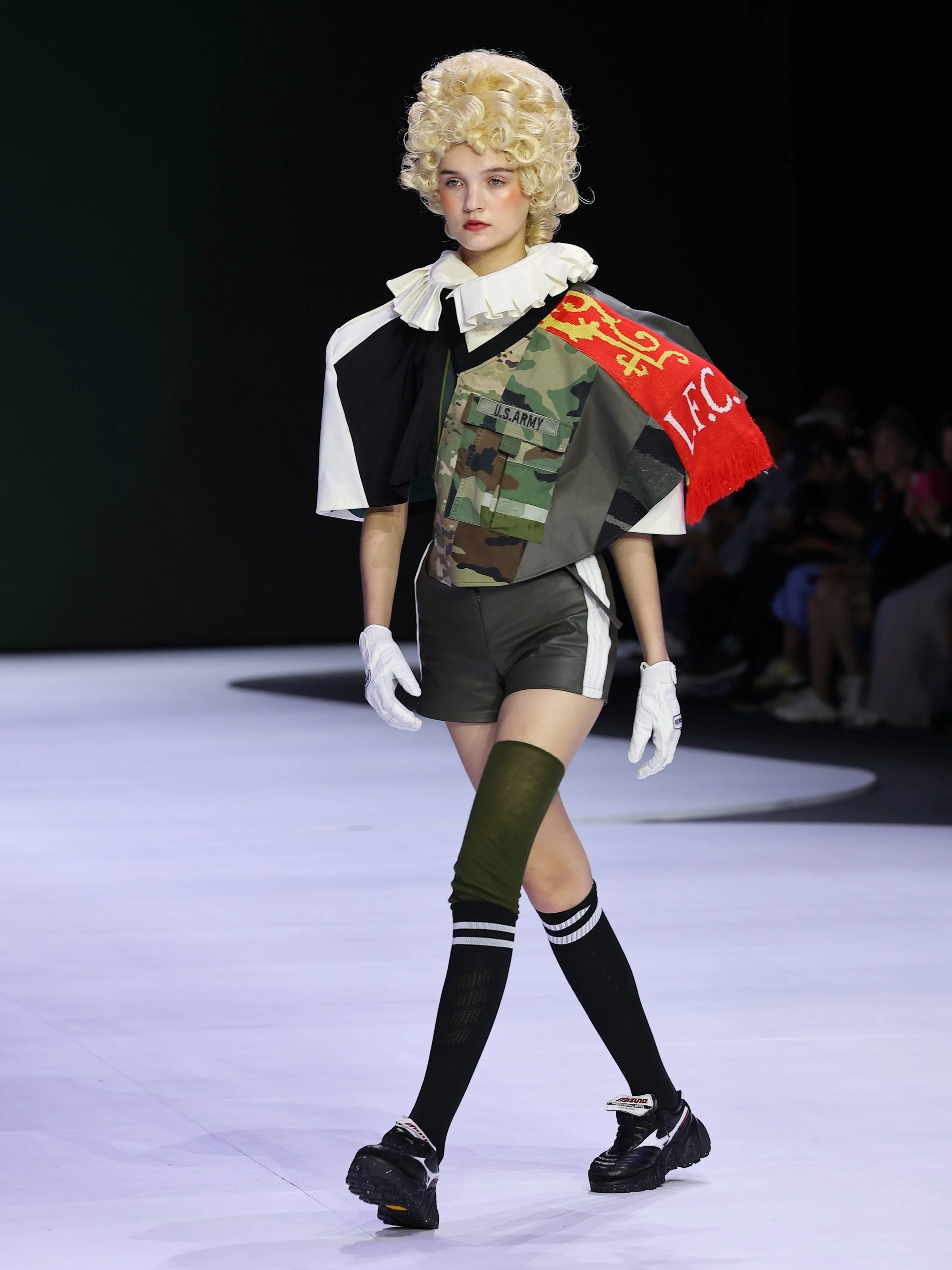 A reinterpretation of uniforms designed for a generation that embraces fluidity and rejects any fixed code. In a world where pure culture no longer exists in isolation, our uniforms are composed of fragmented pieces—woven together from memory, conflict, and style, all held in dynamic tension. This season, we boldly reimagine early football kits, military tailoring, and Victorian silhouettes—transforming these traditional forms into oversized, modular designs that challenge convention. Protective yet poetic. Unapologetically hybrid in nature. Jerseys clash with camouflage patterns, while skirts resonate with the structural echoes of crinolines. Every stitch carries a deeper question about our identity and who we are. There is no single origin. No defined team. No fixed cod