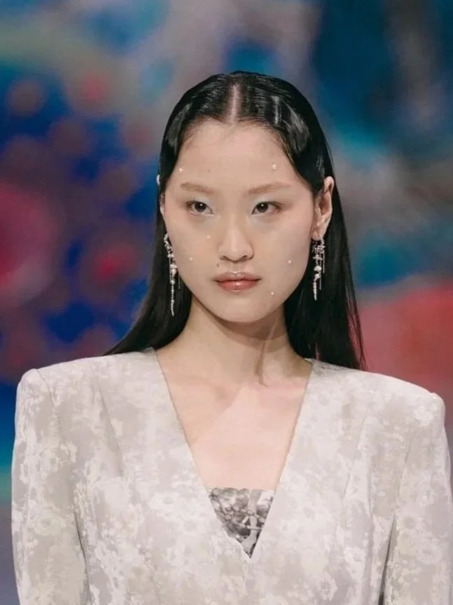 Her complexion was flawlessly radiant, featuring a dewy finish that highlighted the pearl accents. Soft, neutral tones defined her eyes, allowing the pearls—meticulously adhered along the brow bone and cheekbones—to take center stage. The pearls varied in size, creating a textured yet harmonious visual effect that caught the light beautifully with every movement.